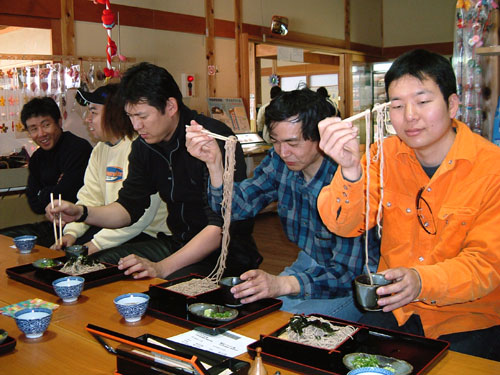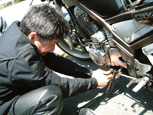 こちらはトラブル続きのAOKI氏。サイドスタンド戻し忘れスイッチのボルトが脱落したため、 gizmo氏よりタイラップを拝借して応急処置。でもなんだか、とっても嬉しそう。 いつもの『峠の茶屋』が混んでいたので、亀石ICで降りて、近くのドライブインでみんなでお蕎麦を食べました。 店員の伯母ちゃんがイイ感じ。お客が裁ききれなくなると、食券販売機を止めてしまう潔さが素晴らしい。 |