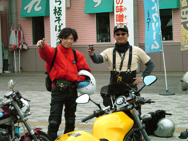 問題は道を知っている人間がいないこと…。集合場所を決めたgizmo氏が仕事の都合で欠席なんだもん。 (んが、gizmo氏は高速道路を駆使し、僕らより先にビーナスラインで待っていた。) 道の駅『ちちぶ』でさらに数台と合流。ポーズを決めるtoto氏とTsuku2氏。 関東組はそのTsuku2氏が引っ張る速い人組がずんずん先に行っちゃって、やがて分散…。 でも、かなり長いこと待っていてくれていたそうです。 |