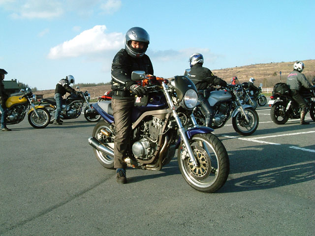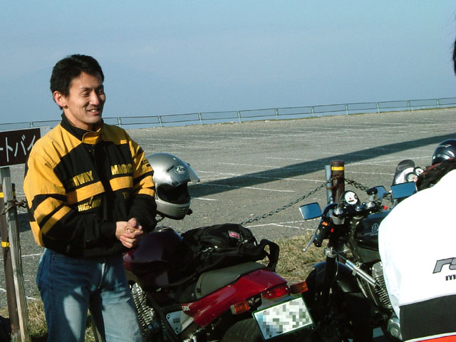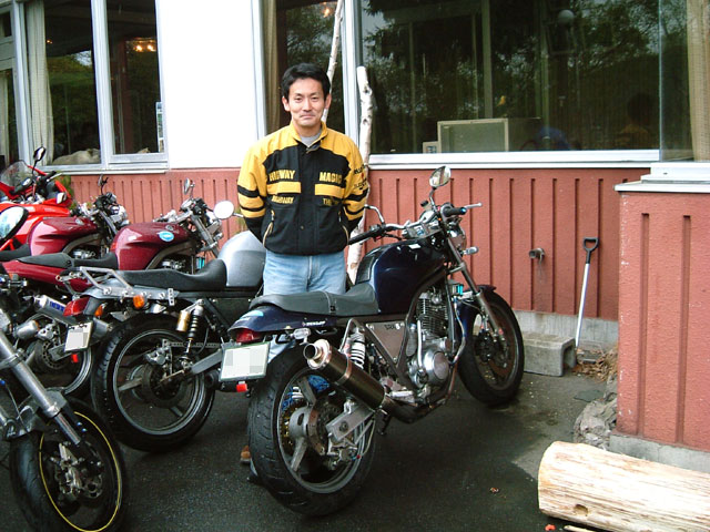 ほんと、Clubman誌やROAD RIDER誌でページを貰ってもおかしくないぞ。 タンクに装着された謎の物体はニーグリップサポーターらしいのですが、○○クーラーとかいろいろ言われてました。 幹事SAM氏。愛車は500cc化+バーハン化+WPフルアジャスタブルその他いろいろ…。 ご本人の話では、「ノーマルです。」とのこと。 |