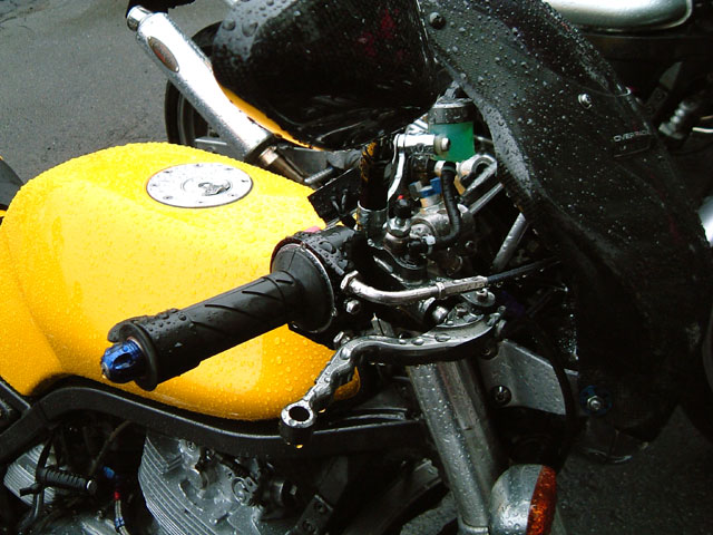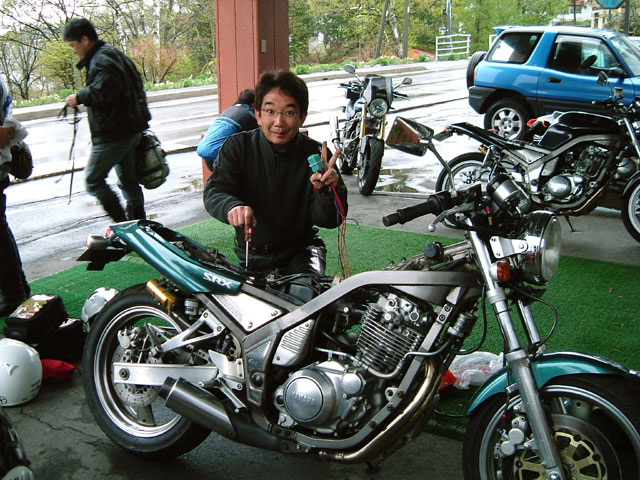 参加者たちが不貞腐れて二度寝を決め込んだのは言うまでもなく…。 雀蜂号の新兵器はベルリンガーのラジアルマスタ。ロングレバーは間に合わなかったけれど、すごくいいとのお話。 昨晩、じゃんけん大会でgetしたgizmo氏特製のヘッドライトリレーを早速装着するよっしー氏。 SRX乗りたちは何処でも店を開いてしまう。(※店を開く…タンクを下ろしてメンテを始めるの意。) |