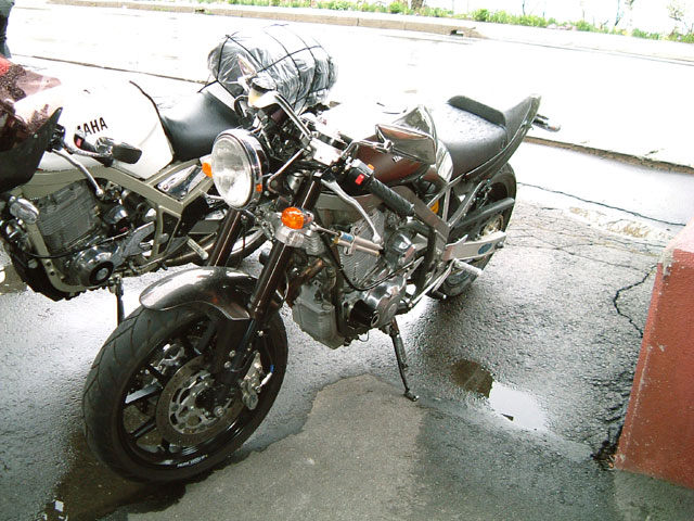 リアブレーキはフローティング。ハードブレーキでホッピングを起こしやすい4型SRXには有効かも。 渋い紺色の4型に跨るのは、幹事1回お休みのなおや氏。わざわざ名古屋から日帰りで来てくださいました。 秋には聖地ひるがので『秋の陣』を催されるとのことで、楽しみですね。 |