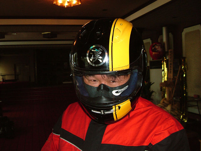 | PYLON氏特性『漢』ステッカーをメットの一番目立つとこに貼って、シールドの下から怪しい視線を送るTsuku2氏。