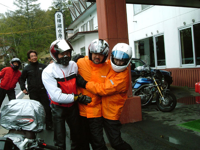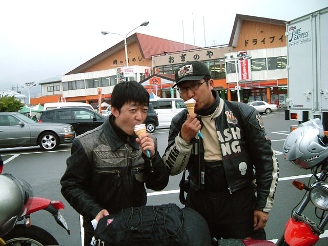 お揃いのかっぱを着て抱擁するBLK氏とtoto氏。すすむ氏ファインダに乱入。ええと、濃過ぎだ君等。 雨足が強まる前に先を急ぎたいMcCourt@管理人。「5分だけトイレ休憩してすぐ出ましょう。」と提案。 しかし。いしざき氏とTsuku2氏のお二人はソフトクリームを頬張り、余裕綽々。 さすがベテラン。ツーリングにはこの余裕が大切だよね。 |