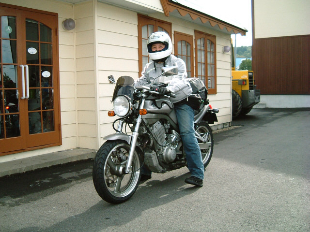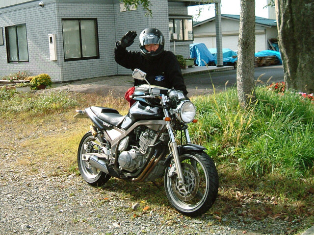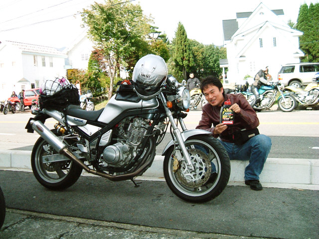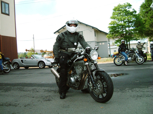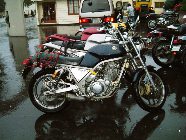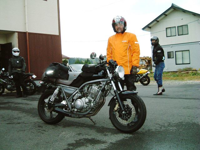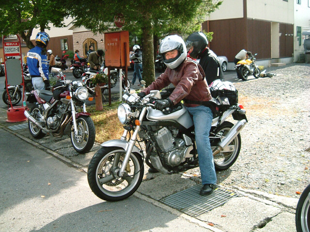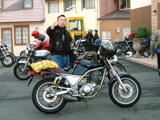 | 「2STじゃないのにオイルが減るんですぅ。」と、とっても高価なオイルを手にポーズのひん氏。 ミントコンディションの3SXに跨りご機嫌のむ〜ん嬢。後ろにちらりと見える車両も彼女の下僕。(嘘ですが) 少し気温が冷え込んでいると感じられたのか、BLK氏は防寒のために合羽着用です。写真失敗してすみません。 | ||