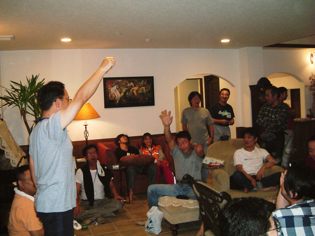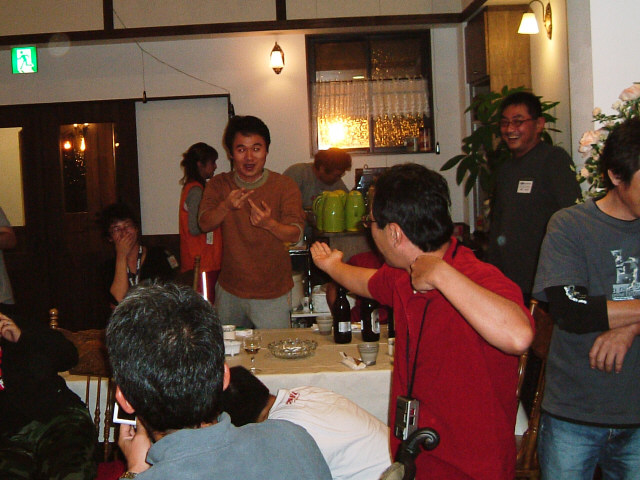 | 今回の宿、『シェソワ ワカミヤ』には、スキー客のための乾燥室があり、 濡れた合羽やジャケットも、一晩で乾くそうです。着替えも済んで、すっかりくつろぎモードの漢たち。 お風呂と晩ごはんの後は、恒例の(?)じゃんけん大会で大盛り上がりなのでした。 管理人も使いかけABSO-Rや、伝説の車載工具「オイラー」などを出品。しかし、それでも裏切り者と罵られる。 | ||