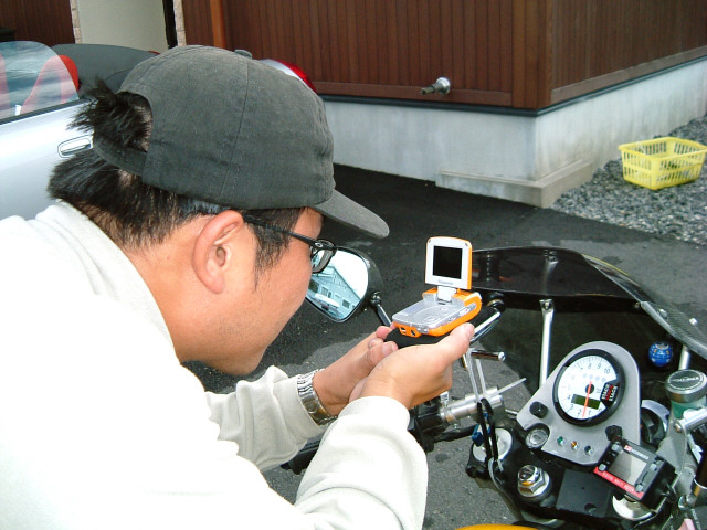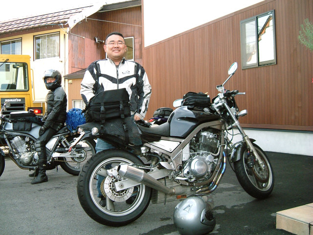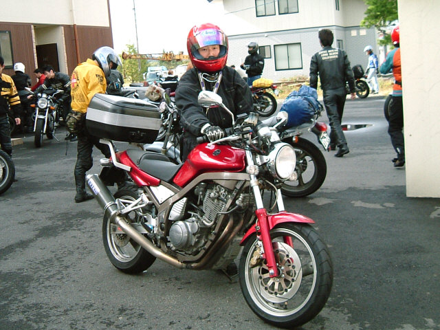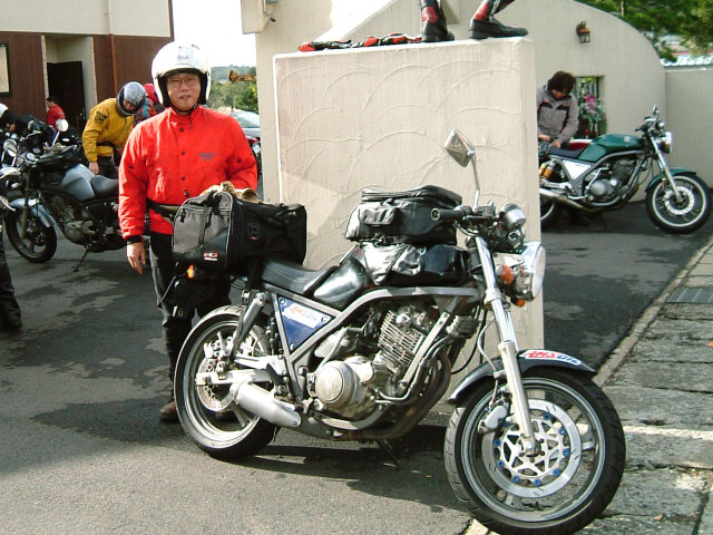 | 皆が着々と出発の準備を進める中、暇を持て余し、手当たり次第に写真を撮るMcCourt@管理人。 とりあえず目が合った人にファインダーを向けているので、顔と名前が一致しません。(失礼な奴だ) 「これ、俺やぞ!」というお方は、man3 BBSに是非、カムアウトしてください。 わざわざ砂利の上に愛車を移動しているのは、この日のため急遽足回り交換という大手術を慣行されたgiz師匠。 Tsuku2氏は、お馴染み雀蜂号になにやら細工を施している模様です。 | ||