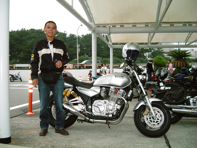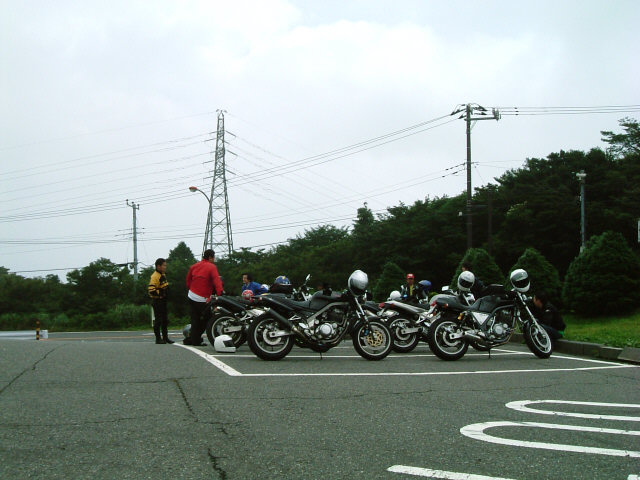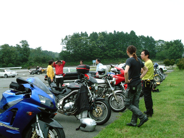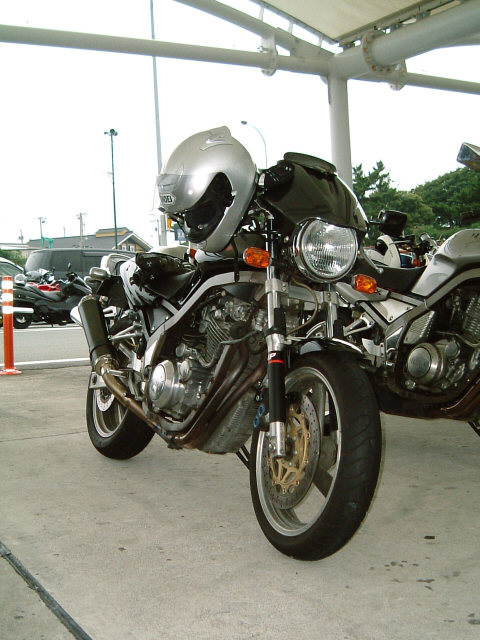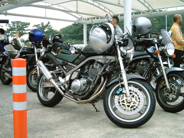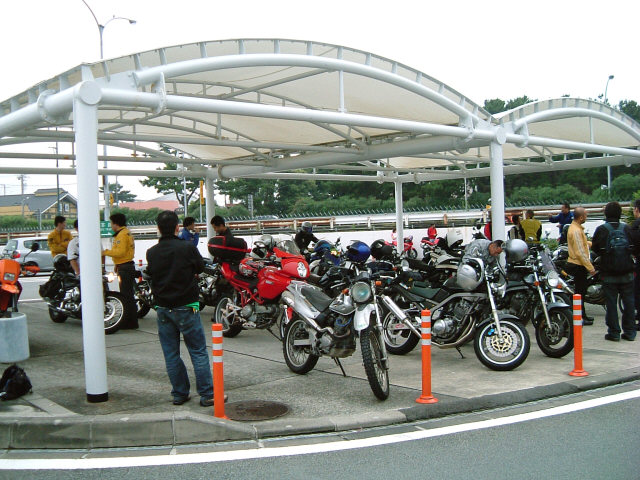 | いつもの様に、西湘PAの二輪用パーキングにて。この日は貸切で、man3参加者専用。(嘘) 写真は、家庭内の政治的問題を玉虫色に解決して今回の参加に至ったShige-rx号。 そして、巷で生ける伝説と化しつつある、SAT氏の漆紫号二本出し号。最近は少し落ち着いたそうです。(本人談) | ||
