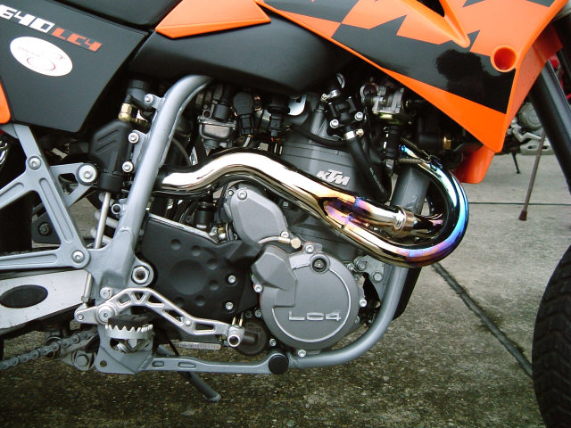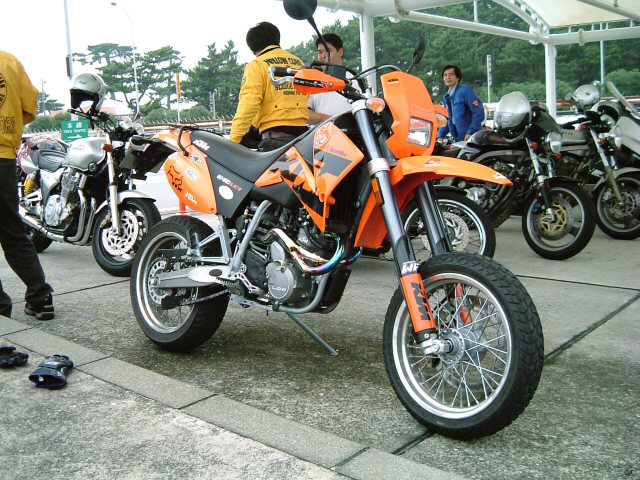 | 大型二輪取得を機に、XJR1200に乗り換えられたこけman氏。なんと、シェイクダウンがman3。 こちらはZEP氏のKTM。通称ジャビッド号(仮)。10連敗しそうな名前だなあと、オーナーはやや当惑気味。 年々厳しくなる排ガス規制に適合するために、'07年はFI化と新設計エンジンが噂される。 負圧キャブのLC4をゲットするラストチャンスと言うことで、遭えてこの型をGetしたとか。 | ||
