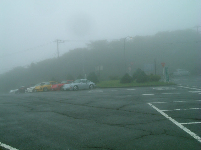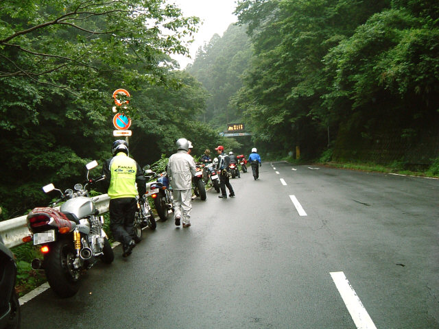 | 降水確率10%だったのに、スタートから不穏な雲行き…。暗いよー。雲が厚いよー。 オレンジラインの途中あたりから、とうとうシールドに雨粒が付きだす。 給油後の集合地点である椿ラインの入り口に着くと、みんな合羽を着用して待機していた。 「こんなコンディションで無理して走っても愉しくないし、危ないので、一旦湯河原のDennysに避難しましょう。」 途轍もなく落胆しながら、参加者の皆さんにその様に伝える。 しかし、大観山で合流予定の人もいる。ガスと霧雨の中、 撃墜 出迎えに椿ラインを駆け上がる数人の漢たち。 もちろんMcCourt@管理人もその中に。「幹事は、濡れとけ」ってことで。 | ||