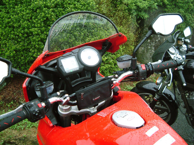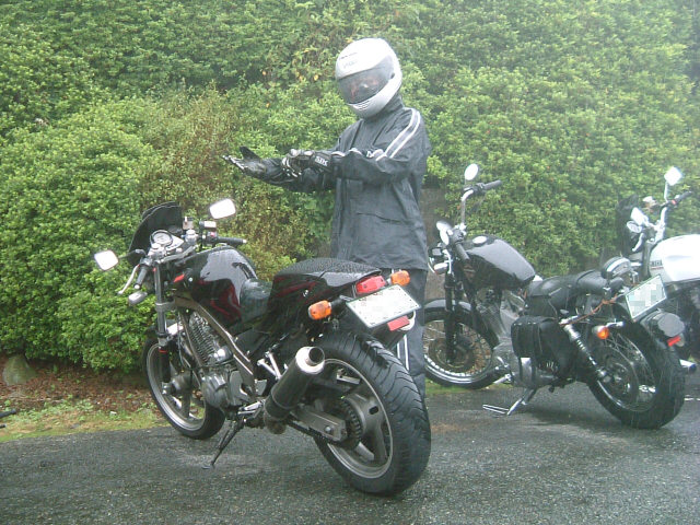 | 大観山合流組のくりはら氏。愛車は昨年、にぅセローにスイッチした。 地元の人なので、帰りに亀石峠集合組の様子を見に行ってくださると言う。ううう、サンクスです。 そして彼も合羽なし(笑) こんな天気でも、IPCV(内圧コントロールバルブ)普及委員会としては、モニター活動も忘れる訳にはいかない。 下りの椿でSAT氏にテストして戴けることになった。 | ||