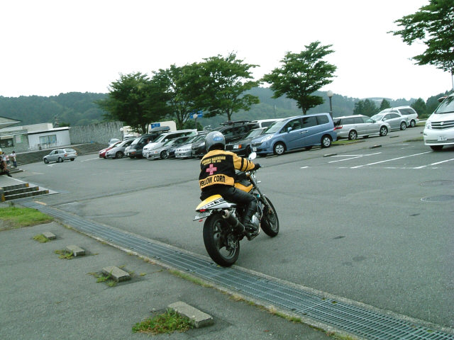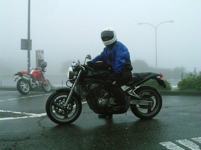| 霧の中に佇むaoki氏。いきなり視界を奪われることがあるので、こんな時の走りは慎重にこしたことはない。 レインウェア着用中のSAT氏。さて、IPCVの評価は…。 「最も変化が大きいのは、スロットルを閉じたまま、ダラーッとコーナーリングする時。 通常なら、どんどんエンブレが増して、ハンドルが切れ込んでしまうところだけど、それが希薄なんですよね。 ばっといきなりスロットルを閉じた時のエンブレの減少はそれほど極端じゃない。 慣れは多少必要だけど、これはアリだね。あと、振動もマイルドになった。 削り出しでの製作なら、価格(税込18,900円!)もまあ納得かな」 McCourt@管理人のムルー。巨大なボックスの中身は…、 (暑くなった時のために)着替えのメッシュジャケットとTシャツ、車積工具、パンク修理キット。 そしてモニター用のIPCV。合羽、積め。 | ||