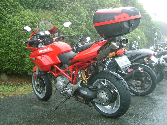 | ウェットでは極端にグリップの落ちる椿ライン。(近年増えた減速帯や路面に書かれた注意書きがとりわけ滑る) 道中、3台ほど、ガードレールに突っ込んだり、横に滑ったり、藪に刺さったりしていた。 他所のグループで良かった。良くない。 初参加のこうぞ氏は、雨で縮んでしまいました。お茶目なリアクションでありまぅ。 愛車は、ハヤシカスタムのスリップオンとカスタムカラーがポイントですね。 | ||
