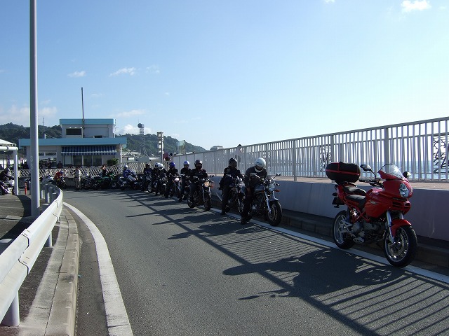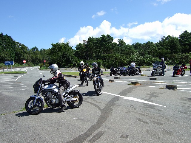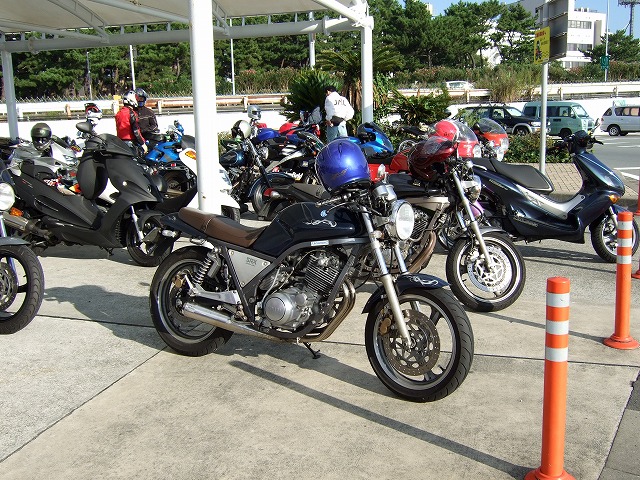 | オレンジラインの出口にて、給油組と無給油組が合流。 前回はここで雨のために麓に引き返したけれど、今日は絶好のコンディション。さあ、リベンヂするぞ! 大観山の直前で少しガスが出てたけれど、椿ラインは全く問題なし。Yeah haaa! パーキングで人垣に囲まれているのはtoto@不死鳥号。 「俺じゃなくて、バイクが人気ある?」…そんなに自分を追い詰めてはいけませんよ(笑) |
