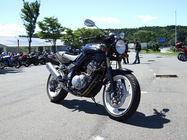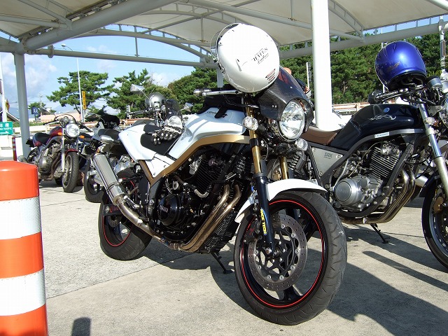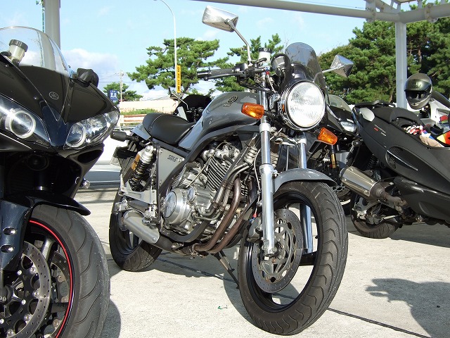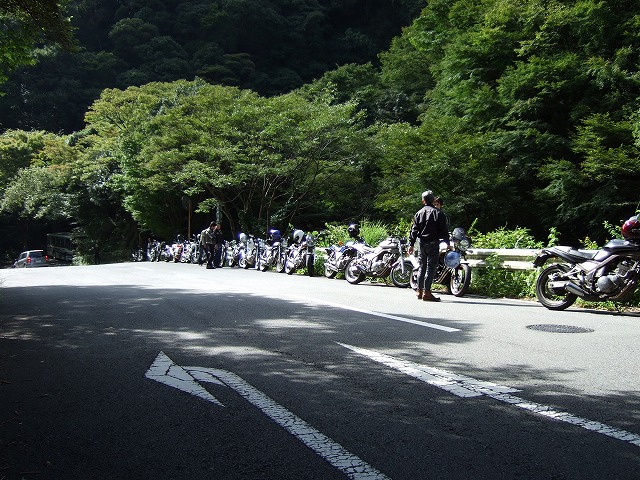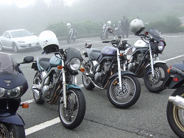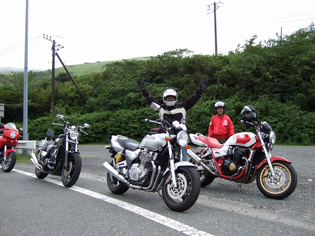 | 限定解除でXJR1300オーナーとなったこけman氏は、今回、仕事仲間とのご参加。 V-maxにCB1300…。この人たちと走るなら、僕も刀号で来た方が受けが良かったかも? 伊豆スカ入口で準備万端のSRX乗りたち。気合充分。 |