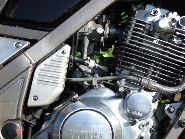 | hanpty氏のSRX(ま、間違ってないよね?)。タン色の渋いシートにラインアートのステッカー。 懐かしいWMのマフラーで、スポーツシングルがブームだった'80年代風の仕上がり。 かなりコンディション良さそうな銀色。Ohlinsとメーターバイザーのみのシンプルなカスタム。 サクライ氏の愛妻号に装着されていたクランクケース内圧コントロールバルブ(略してIPCV)。 カタナ用に購入したとのことですが、生憎大きな変化を感じられなかったため、SRXに装着したとか。 やはり、マルチより単気筒の方が効果がある様です。 |