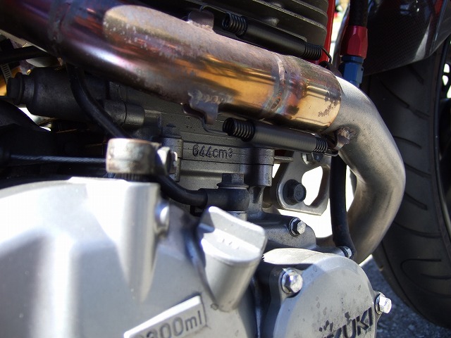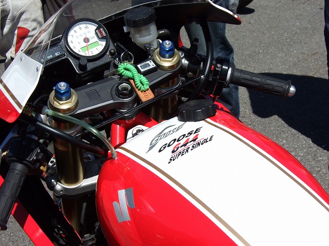 | GLUGLUさんが持ってきてくださった、GOOSE644です。 350ccの車体に、DR650のエンジンを載せて、オリジナルの外装に身を包んだスペサルマシン! 基本的にスズキ党の管理人にはたまらんです。 |