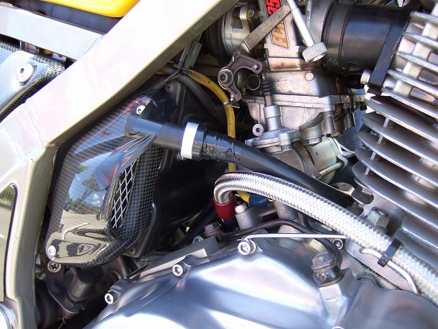 | The Simple特製、リードバルブ型IPCV。 分かりやすい様に外に出しているけれど、実際はエアクリーナーボックスの内側から、 ブリーザーの穴に差し込んで装着する。 (RAM圧の導入口はキャブセッティングが出ないために塞いでいるとのこと。) 本家IPCVとの比較試乗は、非常に興味深いものでした。 作動性はNAG製が明らかに上を行くのに、程よい抵抗があるリードバルブ式の方が、 感覚的にトルク感があり、エンブレも程よく残っているため、比較的普通に乗れるのです。 慣れの問題もあると思うけれど…。NAGファンとしては、ちょっと悔しい悩ましい(笑) NAG製IPCVは、高性能故にエンジンが軽く吹け上がり、振動も減少して荒々しさがなくなるため、 それがトルク感の希薄さに繋がる場合があります。 例えば、足首にウェイトを巻いてジョギングすると、 外した時に身体が軽くなりすぎて違和感を感じることがあるけれど、その感覚に近い。 (ダイナモで計測すると、むしろトルクもパワーも全域で非装着の状態を少しづつ上回ります。) 効率の良さがそのまま乗り味の面白さに繋がらないのがオートバイの面白いところで、 マシンのコンディションやセッティングに拠っても評価は変わってくる筈です。好みもあるよね。 ちなみに、Simpleさんのお話では、リードバルブ式はセッティングがかなり繊細で、 ほんの少しの調整でフィーリングが激変するそうです。 IPCVには機能部品としてだけではなく、 最終的なエンジンのマシンの味付けを決めるパーツとしての可能性も大きいことが分かります。 このリードバルブ式、割と簡単な造りなので、 ケース内圧遊びを体験してみたい方はDIYされてみてはいかがでしょう? |