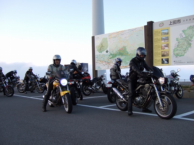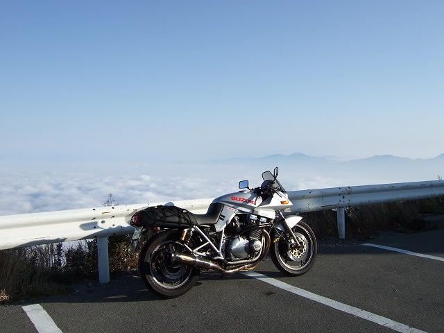 | 二日目朝の美ヶ原は、息を呑むような絶景。スゲー、雲海だー。 昔、gizmoさんとこのHPにもここから撮った写真があったね。 でも、白樺湖からここまでは結構遠くて、ガス欠にひやひやしながら降りてきたmakotoさんなのでした。 |