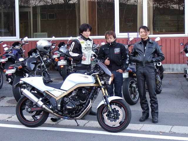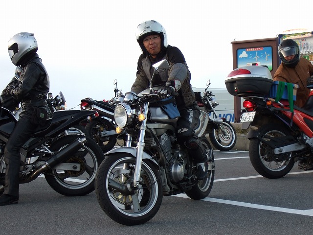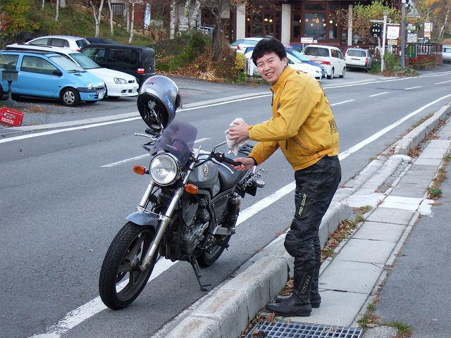 | そんなこんなで深夜まで大騒ぎだった訳ですが、 翌朝6:30には、TMR680氏が「晴れてますよー。朝練行くよー」と起こしてくれました。 ウェスで愛車の朝露を拭き取る寅楠@自分のHNを漢字で書けなかった氏(笑) toto@不死鳥氏、Kei@赤忍者氏、SAT@金髪の以下略氏のスリーショット。 |
