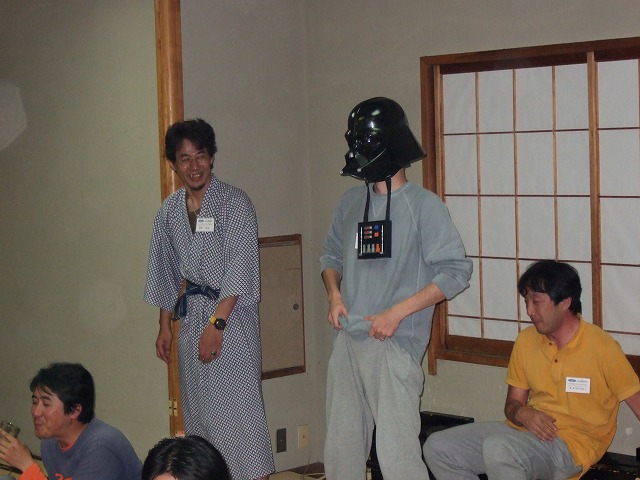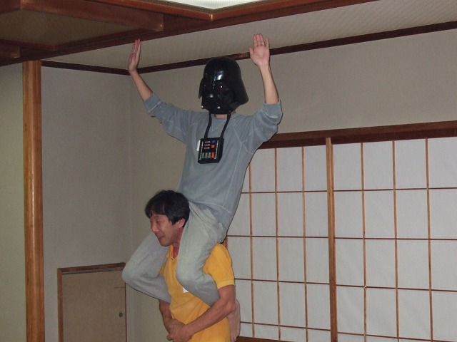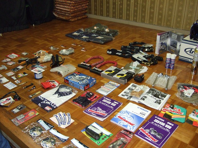 | 全国オフの名物、ずらりと並んだビンゴ大会の景品。なんと全て参加者の持ち寄りなのだ! ちなみに、キャブ仙人殿が出品した新型IPCVを真っ先にGetされたのは、やっしー氏でした。 (新型に内蔵された樹脂バルブの材料コストは従来の10倍!)HPのインプレUP、待ってますよー。 ダースベーダーのアタマを手に入れてご満悦のがんちょ氏。 吉村氏、何を思ったのか、がんちょ氏をおもむろに肩車し、広間を練り歩き始めた。 |