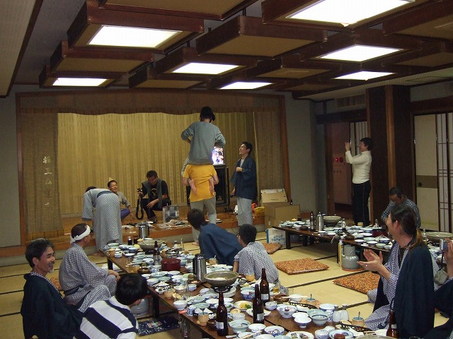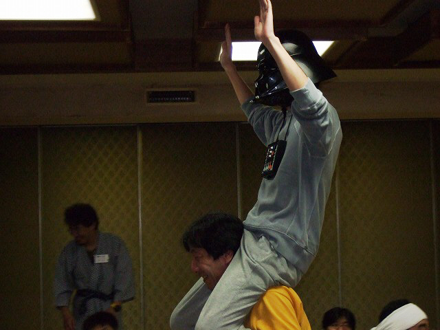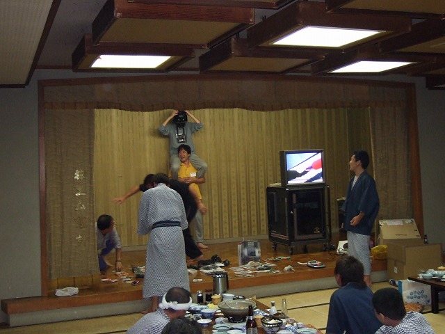 | この派手なパホーマンスに会場は大盛り上がり! んがしかし、背負う方も背負われている方も酔っ払っていることを忘れてはいけません。 この後、がんちょ氏は壇上で落っことされて呆然としてしまうのでした(笑) |
