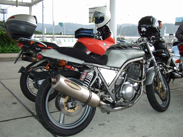 | 小雨煙る箱根旧道を経由して、道の駅「富士川」に到着。ここでおぎん@みかん色号氏&yui姉に合流。 「をぉっ。まな板セローがバーヂョンアップしてるじゃん!?」 「おーっ、ほほほほっ♪」と高笑いのYui姉。この人、たまに女王様キャラに変身する。 路面はまだしっとりと濡れているけれど、どうやらここで雨雲ともお別れできそうだ。 ぢゅくちょのSRX(?)は、人呼んで紅鮭号。何時見ても、不思議なデザインである。 |