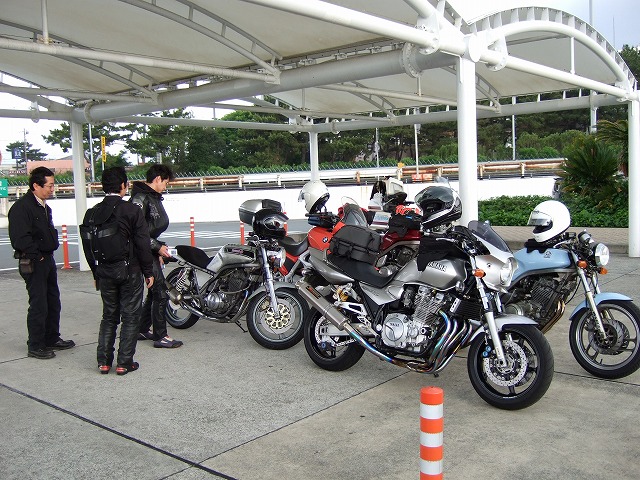 めずらしく一番乗りのmakotoさん。自分が幹事の時だって、こんなに早く着いたことはない…。 予報がぁゃしぃこともあり、日和って高速を使う人が続出して、結局、ここに集ったのはたったの5人。 ま、このくらいの台数の方が走りやすいよね。 Takashi氏は、なんともダーティな全身蛇柄模様のマシンを駆って登場。 自身の作業で外装にドライカーボンを貼り付けたそうな。(面倒くさいからショップからは断られたと(笑)) |
