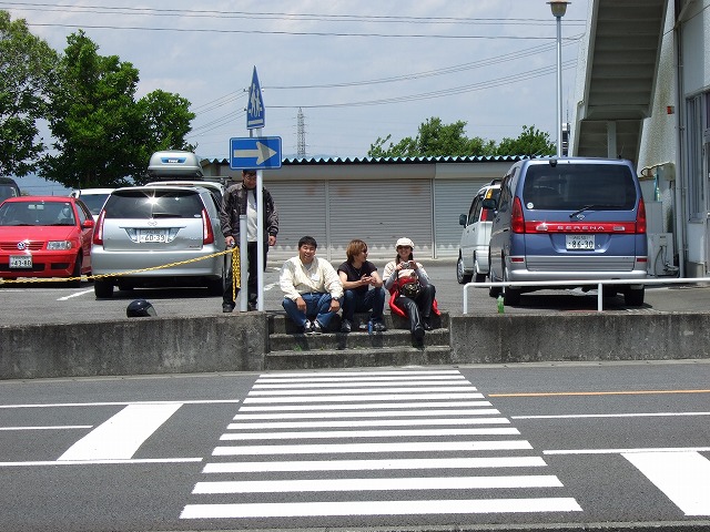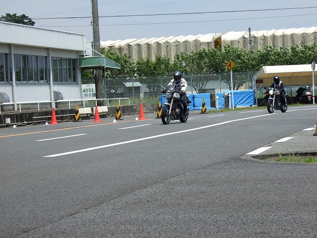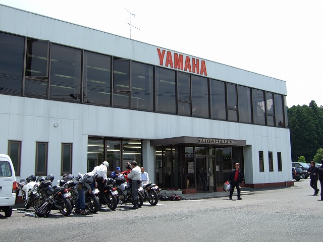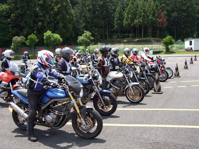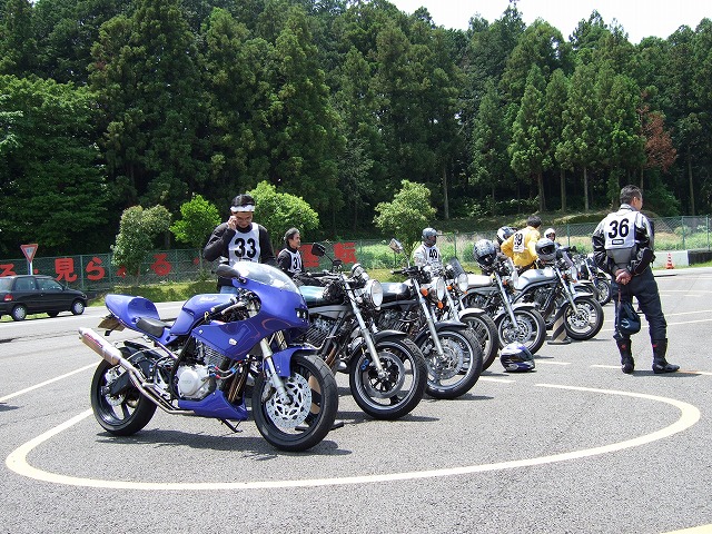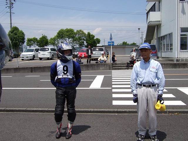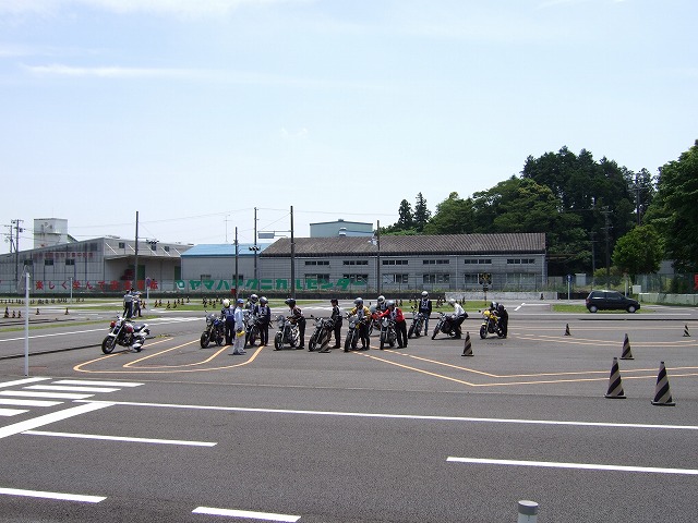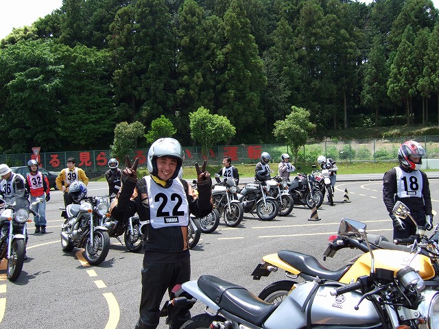 | 袋井に着く頃にはすっかり雨も上がって、暑いくらい。 会場となったヤマハテクニカルセンターは、これから二輪の免許を取る人が練習をするところなのだが、 ここで改めて参加者に基本を学んで貰おうというのが今回の趣旨らしい。 レンズに爽やかな笑顔を向けてくれているのは、ぱんちょ氏。 |