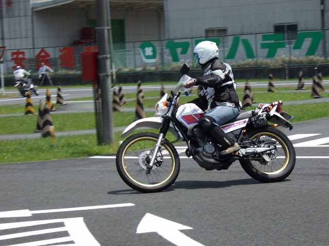 | 左から見ると、まな板号もフツーのセロー(笑)ヒザのプロテクターに気合が入っています。 SRXが20年ぶりの愛車と言うキャブ仙人殿。誰よりも熱心に教官のお話を伺っているようでした。 デジカメはシャッターを押してから記録までにタイムラグがあるので、走行車両の撮影には、コツがいる。 中途半端な写真ばかりの中、一番ピントが合っていたのが、この寅楠氏の後姿。 |