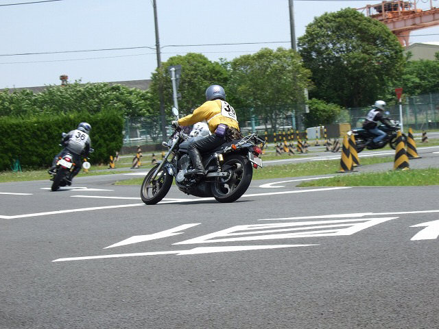 | いよいよ走行開始。外周をゆっくり走って、タイアを暖めてからコースに入る。 Uターンはともかくとして、パイロンを置いてのS字なんて公道ではまずやらないから、なかなか難しい。 ビッグシングルはトルク変動が大きくて、ジムカーナ的な走りには向かないんだよね。 (無論、へたっぴの言い訳です <( ̄^ ̄)>) |