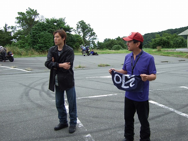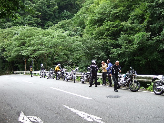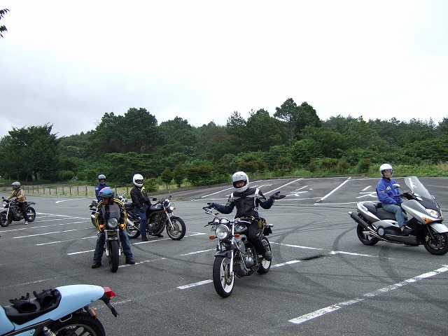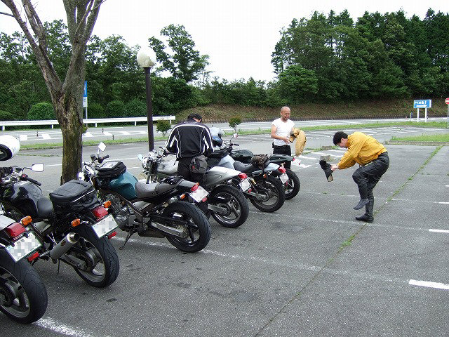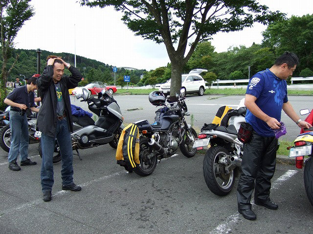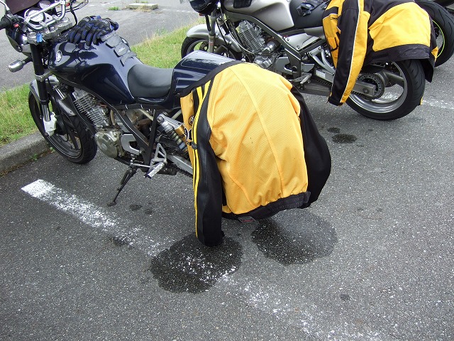 | 被害状況その一:つねお氏のTサツの色の変わり具合に注目。 被害状況その二:水も滴る…。誰一人として合羽なんて持ってきてない。 バーハン+メッシュジャケットの組み合わせが、最も雨水の浸入が激しかった様子。 コンチハン+レザージャケットだった管理人は、 タンクべったりに伏せて全面投影面積を減らしながら走行していたことが幸いして、 アンダーウェアへの水の浸入はほぼ皆無でした。やっぱバイクはセパハンですよ。 (それでもブーツとグローブはぐしゃぐしゃになった。気持ち悪いょ) 一時間ほど待って、ひょっとしたらコンディションが快復しているかもと、 そらいろ号で様子を見に行くも、韮山峠から先はやはりフルウェットのまま。 |
