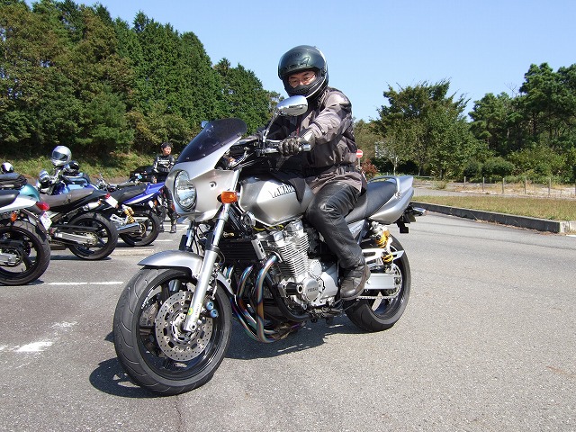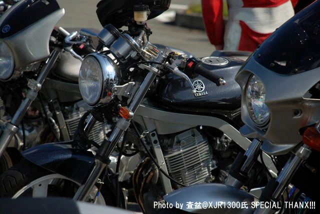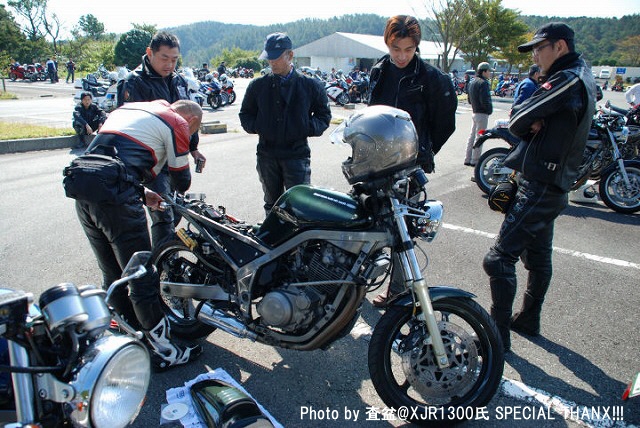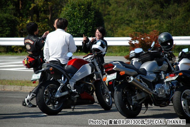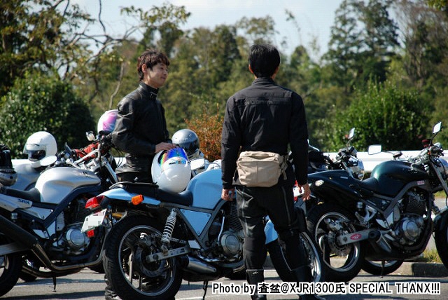 | gizmoさんのお知り合いでときどき遊びに来てくださる、査盆@XJR1300氏。 撮影中にレンズを向けたら、気付いてくれて、ピースサイン。 写真がご趣味とのことで、今回のレポ用にどうぞと何枚かご提供いただきました。多謝! | ||