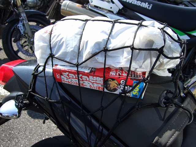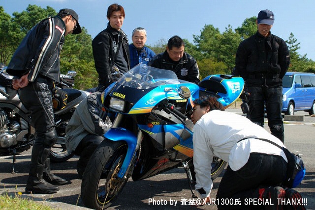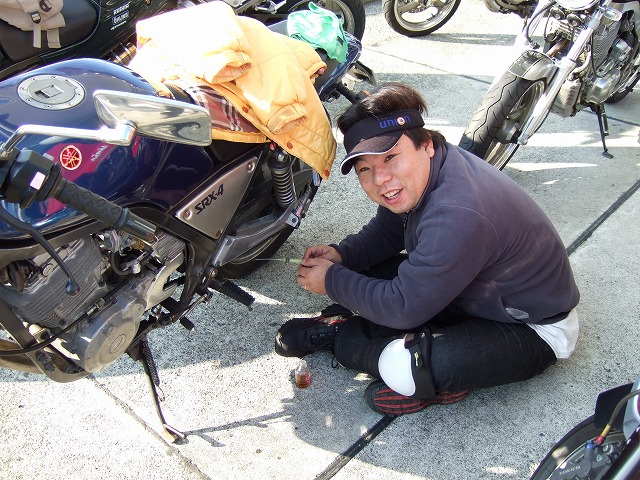 | 重い俗世のしがらみ(車積工具)を外し、しばしのフリー走行を愉しんだ後の管理人。 「んー、やっぱり座面が高いシングルシートの方が乗りやすいなー」なんて会話をしてます。たぶん。 harada氏、テール回りをなんしかされていますが、ウインカーが振動で落っこちたかな? 何処でもお店を開いてしまうSRX乗り(笑) | ||