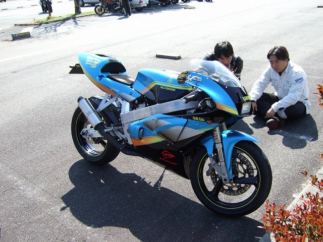 | うね氏改め、KAZUKI氏がハヤシカスタムに依頼して、二年以上の歳月をかけ仕上げた ニコバッカーSRXの正面に座り込み、「スーパーシングルってのはなあ…」と講釈を始めるSYHN氏 < 違 よほど琴線に触れたのか、マシンから「近いよ!」って諭されそうな迫り具合であります(笑) 革つなぎで初参加のtaka氏は、走行中に自慢のツインテールからグラスウール爆弾を投下し、 サイレンサーがガラガラ状態…(笑)残念ながら、ここで離脱です。 | ||
