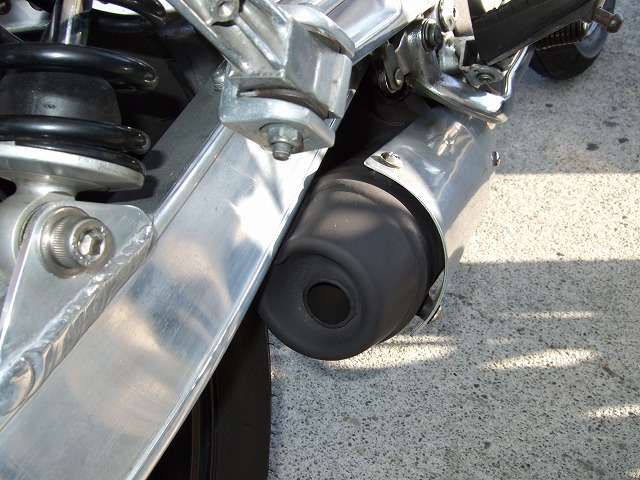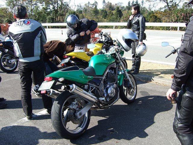 | 西湘PAに到着するいなや、待ち受けていた参加者たちに「あれー!?そらいろ号は?」と突っ込まれる。 いや実はかくかくしかじかで…、と説明するが、なんだか信用されてない感じ。 レイダウンキットを組み込んで、スイングアームとマフラーが干渉してしまったnakamura氏のマシン。 バーナーでマフラーが真っ赤になるまで炙ってから、がんがん叩いて凹ませたそうな。…漢だ漢がいるよ。 パンチングメッシュの革ツナギはtaka氏。寒いっしょそれ(笑) | ||