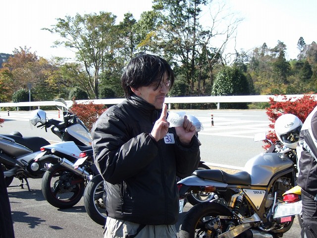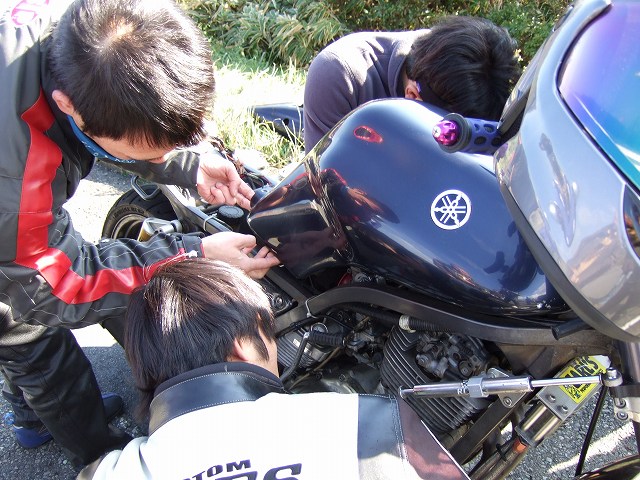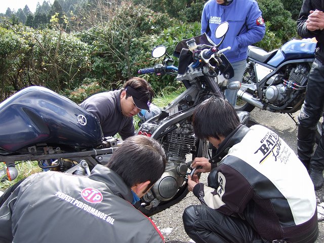 | めずらしく椿ラインに白バイが走っていて、参加者すべて、すれ違いざま怒鳴りつけられたという。 なぜあの人たちは、周囲を威嚇し、一般車を動揺させるような行動ばかりとるのだろう。 まったく理解に苦しむ。あのようなマナーの悪いライダーになりたくはないものだ。ぶつぶつ。 さて、大観山ではそこでもここでもトラブル発生中(笑) 小次郎氏はウインカー破損。モティ氏はヘッドからオイルを吹いている。経験豊かな素人メカたちが よってたかって直します。僕も手伝いたいけど、手を出す余地がない。 | ||