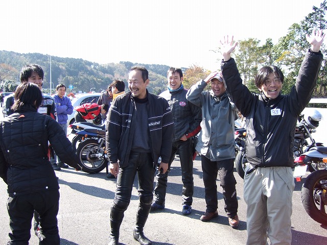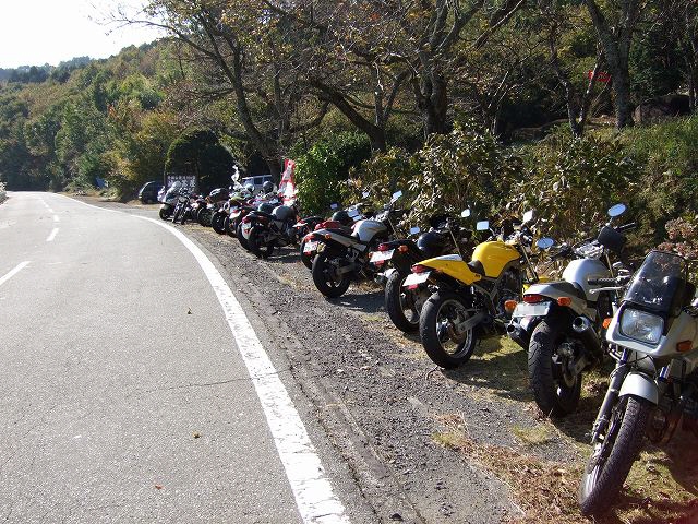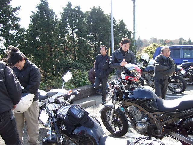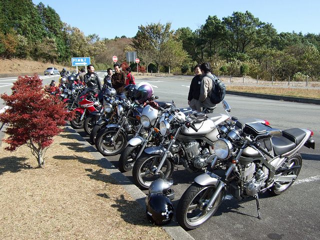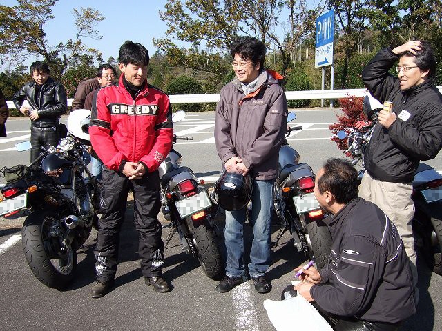 …あれ?なンかブレーキがスカスカしてる。 フルードが漏れているのかとチェックするが、異常なし。 このままでは遅刻してしまうと、慌てて刀を引っ張り出し、暖気もそこそこに走り出す。 首都高は予想していたよりずっと寒かった。油温がちっとも上がらない。 なんだかお腹も痛くなってきたし…。と、集合場所の西湘PAに着く直前、刀のオイル警告灯が点灯する。 やヴぁい…。前日、交換したオイルの量がちょっと少な過ぎたか。 バイクを直立させると、オイルレベルはLOWぎりぎりか、ちょい下ってところ。 うーん、大丈夫とは思うけれど、高回転は控えた方が良さそうだ…。