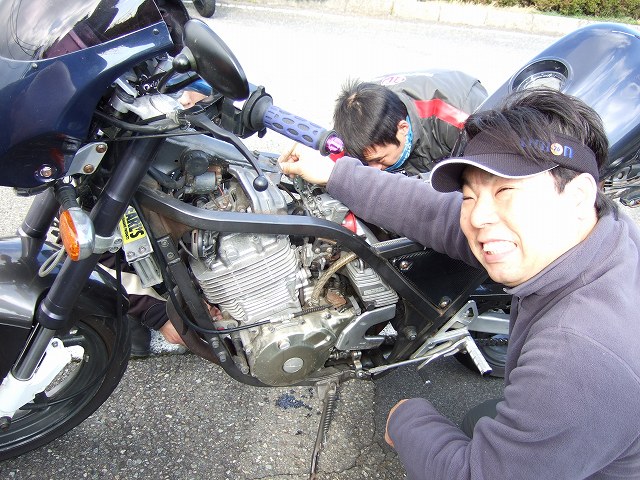| オイル漏れの原因はIN側タペットカバーの締め忘れでした。てことは締めれば走れるね♪ 大観山のパーキングは冷たい風が強烈に吹き付けて、めっさ寒く、 「せめてもう少し風の来ないところに移動して作業しようよう」と控えめに意見してみたが、 素人メカ一同、華麗にスルー。SYHN氏は人のバイクが弄れてとっても嬉しそう!?(笑) | ||