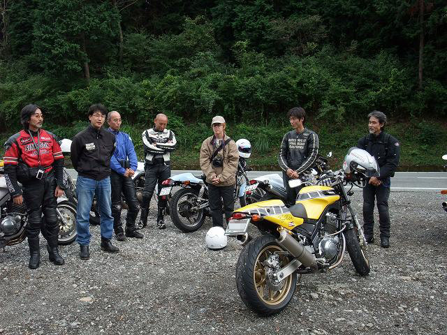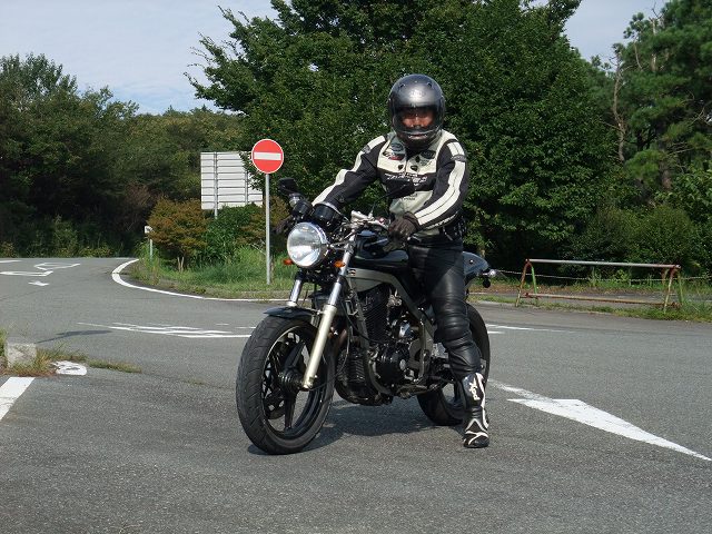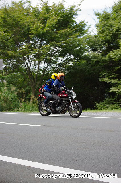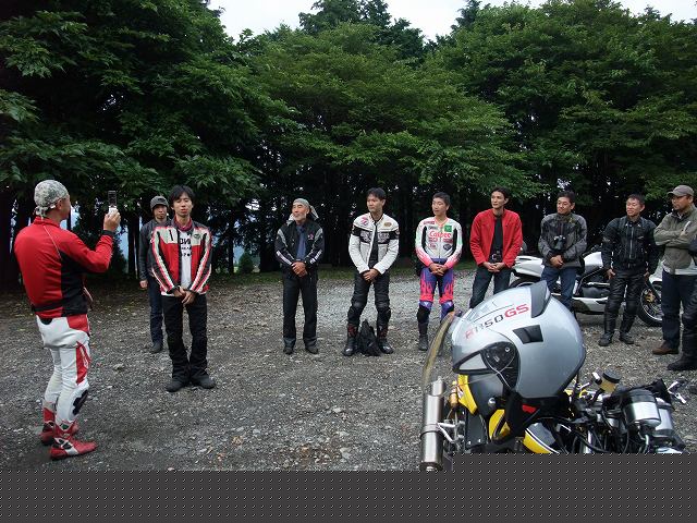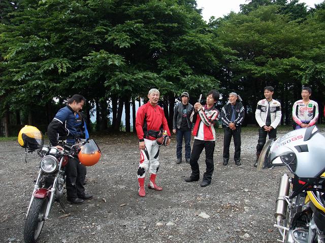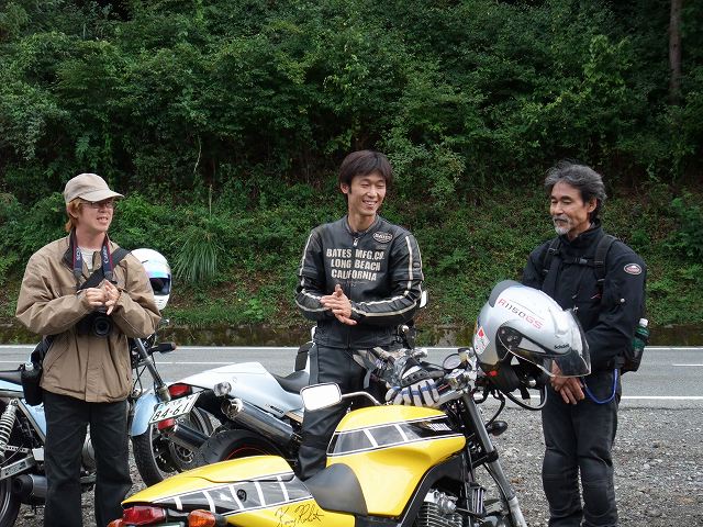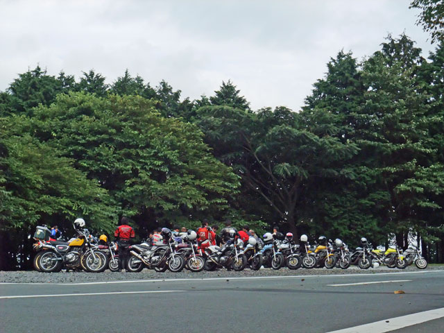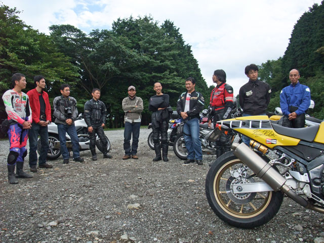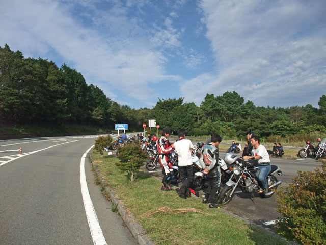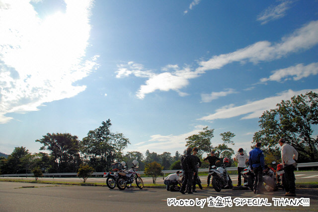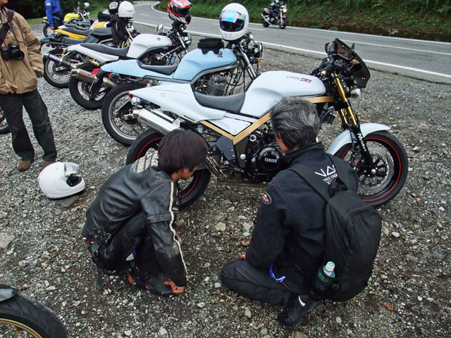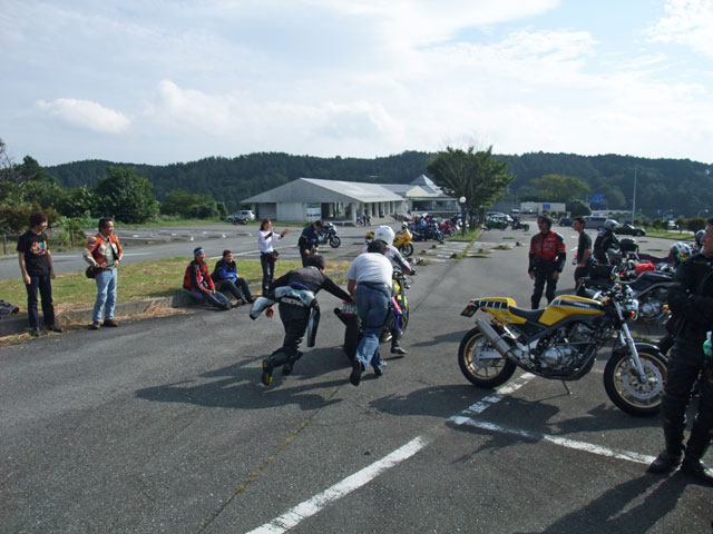 | 猫カップル劇走(笑)。タンデムライダーが怖くないように気遣っている様子が写真からも伺えます。 このPAは回り込んだ中速コーナーの先にあるので、勢いのまま通り過ぎちゃいそうになる人多し(笑) toto氏は仙人殿にワンオフマフリャヲをプレゼンテーション中。 「ちょっと抜けが良くなくない?」「なくはないと思わないこともない。」どっちやねん。 (※注:台詞は全てmakotoさんの捏造) |
