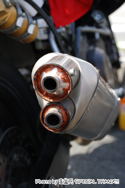 | 一部で、「新種の白いの」と畏れられるおおの氏のマフラー。 ヨシムラのトライオーバル管ですが…、真面目なんだか不真面目なんだか(笑) 「蒼の隠者(harmit blue)号」。多忙な中、仙人殿もこまめにアップデートを重ねられています。 harabow氏の「カチカチ山の泥舟号」。シングルスポーツの魅力に溺れゆく氏の生き様が名前の由来。 ここまで完成度を上げちゃうと、もっと良い名前が欲しくなりますね(笑) |