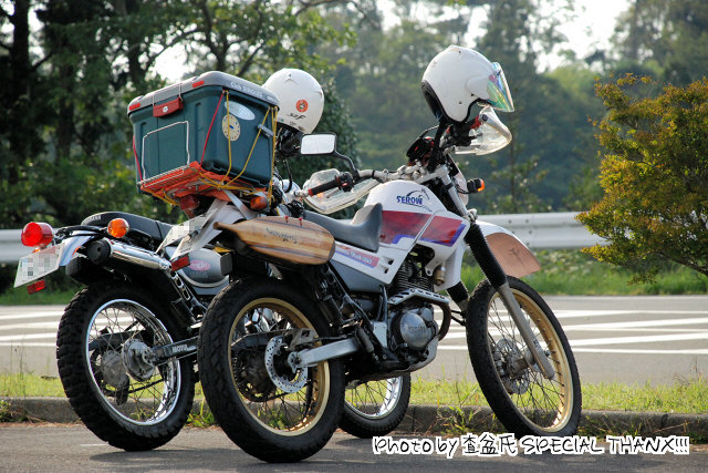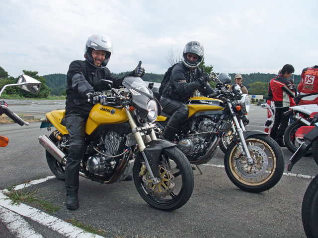 | 床屋のタイセイ氏はバッテリー上がりで、600ccビッグシングルを押しがけ! toto氏はここでもワンオフマフリャヲのセッティングに余念がない。 「バッフル抜いたら抜け良くなりますかね?」ちょ、ちょっと、アフターファイアは大丈夫ですか? 健気にSRX軍団を追っていた、おぎん氏のブロンコちゃんとYui姉さんのまな板セロー(箱付き)。 |