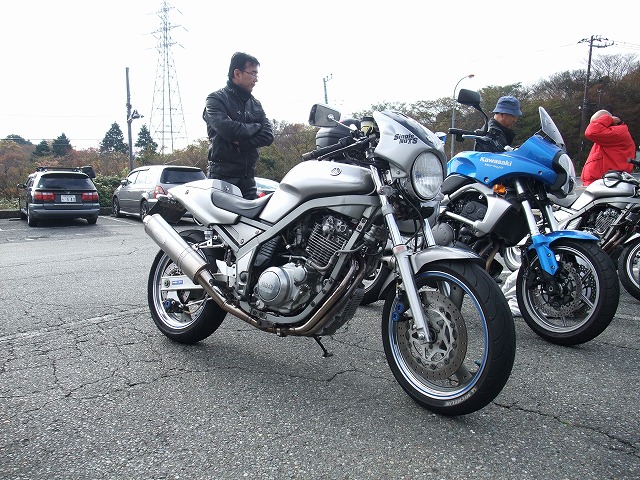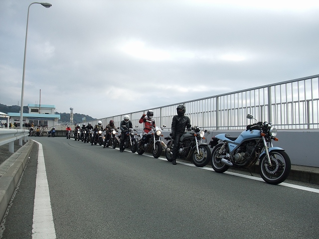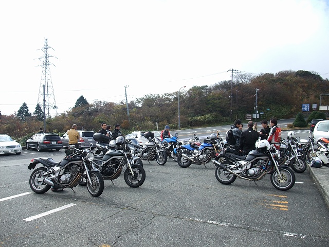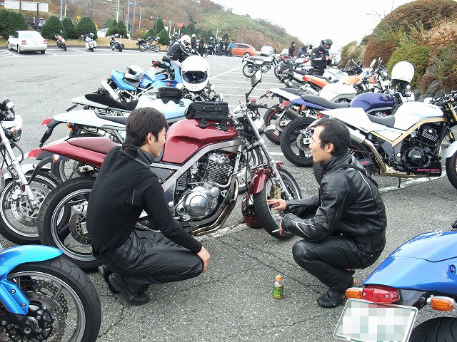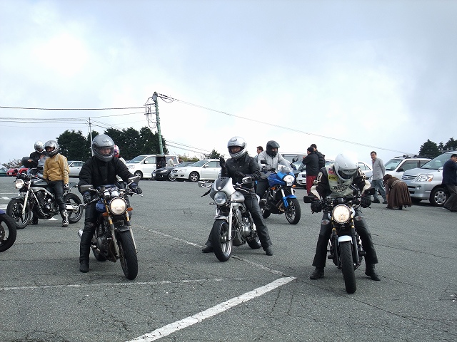 椿ラインを愉しんだ後は、大観山で皆さん一服。 toto氏&Takashi氏、あっこちゃんのマシンを前に悪巧みの相談中です。 午後から予定があるとゆうたけ氏がここで離脱。 man3は何処で合流するのも、何処で離脱するのも自由。幹事が適当なだけとゆう噂もありますが。 |