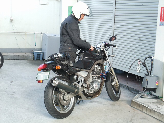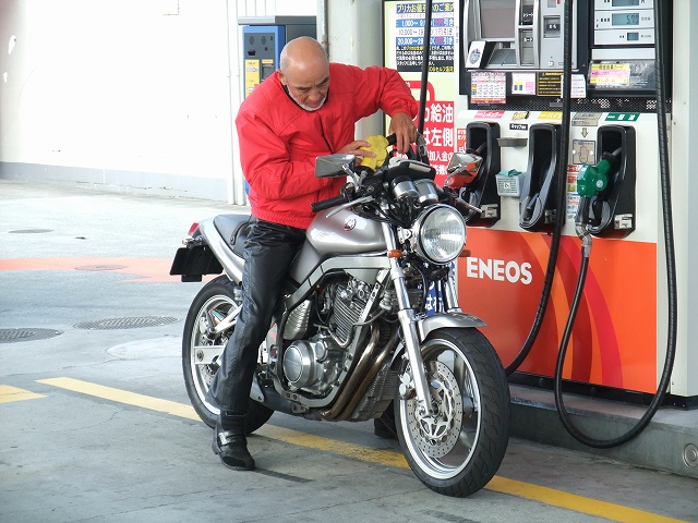 | まづは麓のGSで愛車の腹ごしらえ。 バイクに跨ったまま給油されているのは小次郎氏。これなかなか難しい技なんです。 ノズル戻すときにバランス崩したら立ちゴケ必至。 危険だからベイビーちゃんはまねしちゃだめだぞ♪ |
