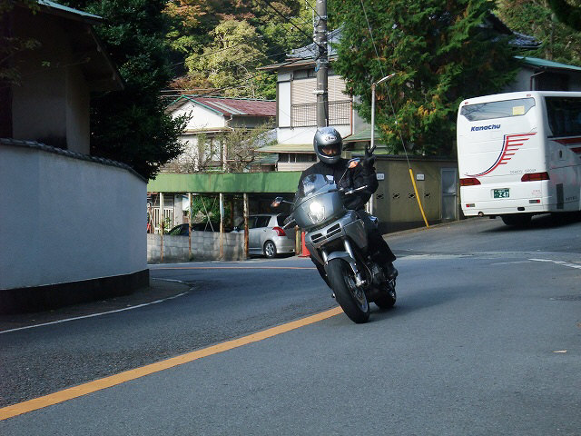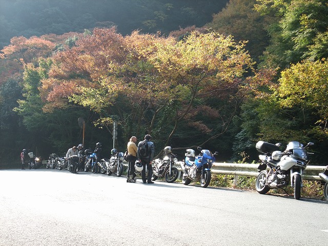 | フロントフォークに小型カメラを設置して動画撮影を試みるのはko-ji氏。 「PSP」という機械で、なんと正体はゲーム機。GPS機能も付いてるらしい。スゴイ時代になったもんだ…。 椿ラインの入り口で給油組と無給油組合流。紅葉がキレイですが、だぁれも見てません(w) ピースサインは、ドゥカティ ムルティストラーダでゲスト参加のイソ氏。元SRX乗りです。 |
