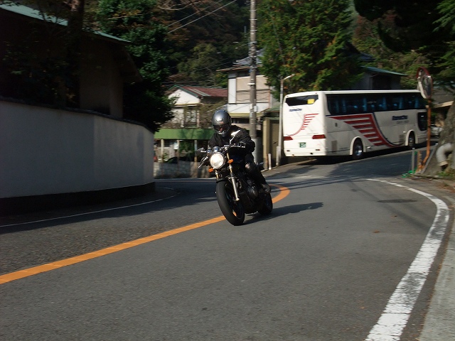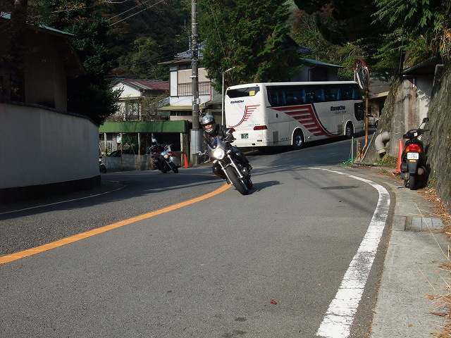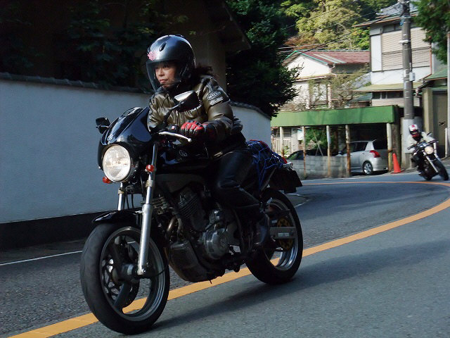| ち、近過ぎた?(笑)男前な走りが一部で噂になっているtomo氏の奥様。 カメラを見つけて余裕のピースサインはイソ氏。さすがに撮影慣れしてますね。 尚、皆さんがセンターライン拠りを走行しているのは、撮影者の後ろに軽ワゴンが駐車してたため。 (誤解する人がいるといけないから、一応お断りしておきます) |