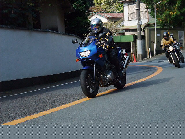 | デジカメの撮影モードを“スポーツ”に設定して、皆さんの走りをこっそり撮影。 だだだだ…。づどどど…。どばばば…。来たーッ!パシャ!…むぅ、ちょっと遠いか、な。 タイミングを図って、もっと引き寄せて…、パシャパシャ!!をぉなかなかいい感じジャン!? sugar氏、新しい相棒となったブルーのTRXがよくお似合いですよ。 |