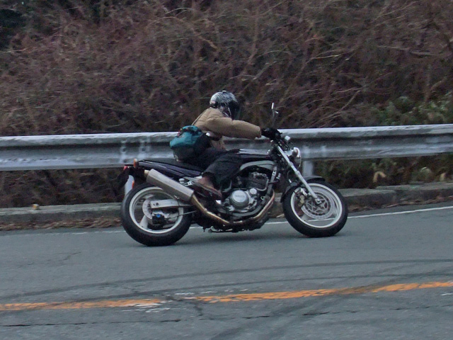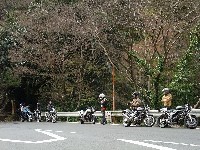 | 椿ラインの麓にて。奥さんとタンデムで参加のSYHN@ヴェルシス氏が準備OKのサイン。 実はまだ数台来ていないバイクがいて、うっかり出発してしまいそうになったのは内緒(笑) 例に拠っていつものビューポイントで走行写真を撮影するmakoto@管理人。 んがんが。デジカメをスポーツモードに切り換えるのを忘れて、その殆どが失敗作。 めいっぱい拡大して、トリミングもして、そこそこ見れるようになったのは、この二枚だけ orz |