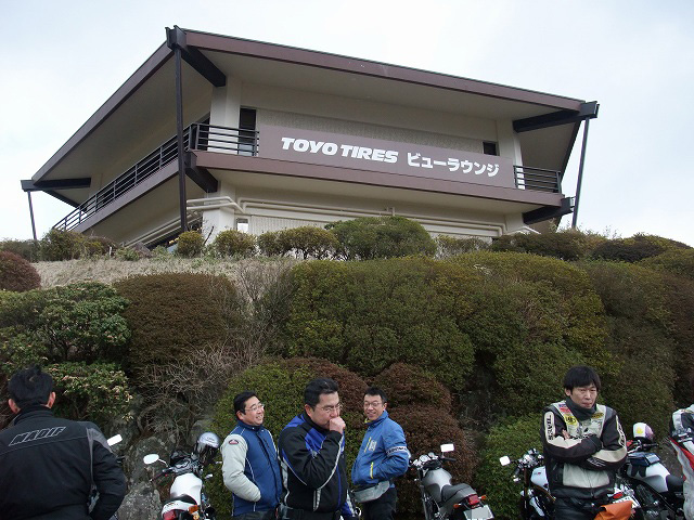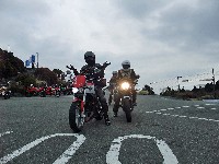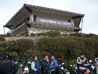 | 寒い寒いと思いながら駆け上がっていくと、 なんと、大観山に辿り着く少し前あたりから、雪がチラついてきた! 気温は1℃。走行動画を撮影するためにtoto氏がハンドルにマウントしていたデジカメが、 勝手に電源offになっちまうほどの寒さ。 (リチウム電池は寒さに弱く、1℃以下ではまともに仕事しないそうです) |