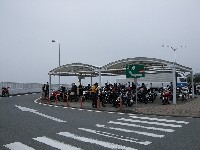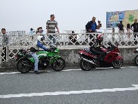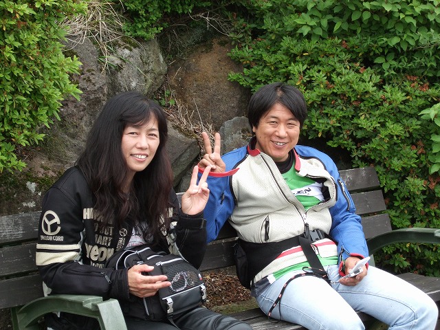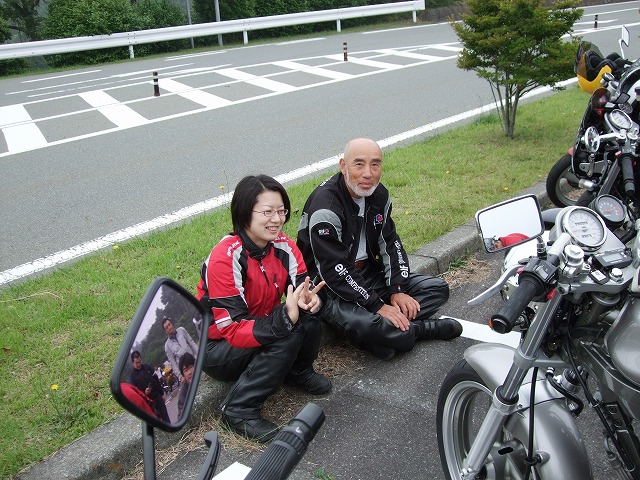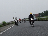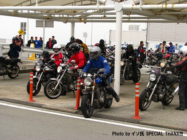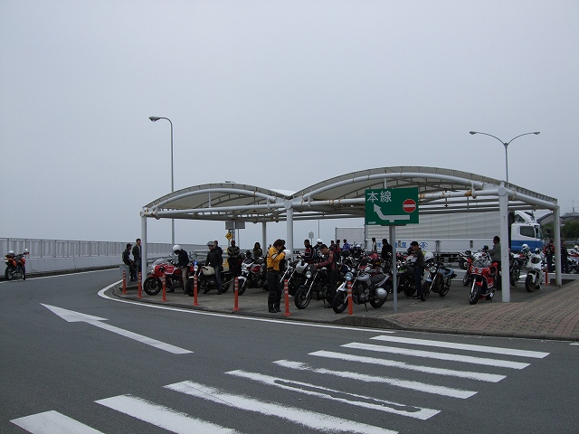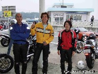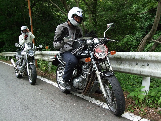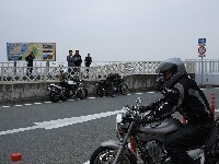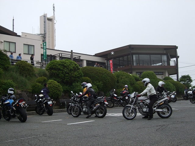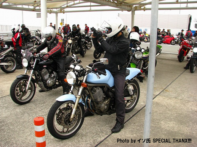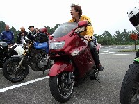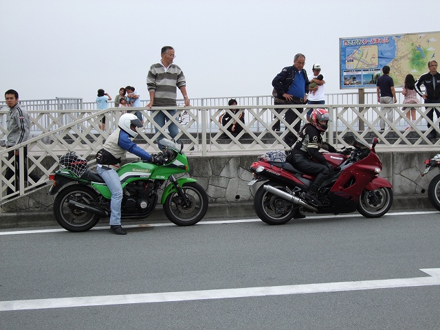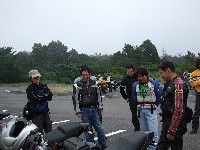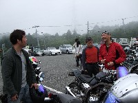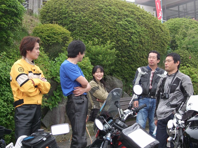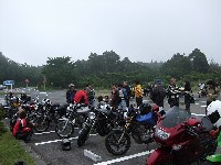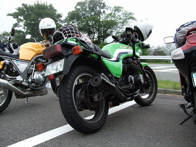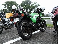 | 簡単なミーティングを終えて、皆さん出発準備。 (撮影時間も場所も同じなのに、イソ氏の写真はずいぶん明るいなあ) バイク餅氏は今回、ライムグリーンのGPZ750で参加。 前のZZ-R1100はYURIさん。開けっぷりが男らしいママさんライダーです。 |
