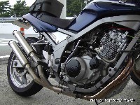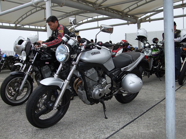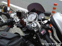 | 曇天の下、西湘PAに集まったSRX乗りたち(笑) The Simple製のタンクカバーとテールカウルを装備するアザミ嬢の“竹之進”号(命名の由来は謎) 後方ではKEN3氏がトップブリッジにマウントしたデジカメをセッティングしておられます。 まだ映像がブレるみたいで、試行錯誤中とか。 |